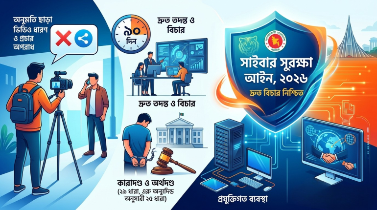 ‘কনটেন্ট ক্রিয়েটর’ পরিচয়ে মোবাইল বা ক্যামেরায় অনুমতি ছাড়া অন্য কোনো ব্যক্তির ভিডিও ধারণ করে সামাজিক যোগাযোগমাধ্যমে ছেড়ে দিলে বা প্রচার করলে ৯০ দিনের মধ্যে তদন্ত শেষ করে ২০২৬ সালের সাইবার সুরক্ষা আইনে দ্রুত বিচার নিশ্চিত করা হবে বলে জানিয়েছেন ডাক, টেলিযোগাযোগ ও তথ্যপ্রযুক্তি মন্ত্রী জনাব ফকির মাহবুব আনাম।